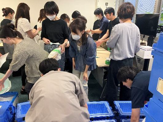 すでに梱包容器への保冷剤の詰め込みは済んでおり、各人が手際よく梱包作業に徹することができました。途中で小さなミスが見つかりましたが、すぐに梱包済みのものも一度開封して確認をしました。慎重さとチームワークが光る場面でした。 その後は順調に作業が進み、予定時間を超えることなく無事終了。昨年からの経験者が多かったこと、そして精度管理部長の人望があってこその成果でしょう。改めて「素晴らしい仲間」と実感できた作業でした。