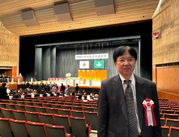 このたび、令和7年10月30日(木)に東京エレクトロンホール宮城にて開催されました「文化の日表彰式」に出席いたしました。県臨床検査技師会より、保健衛生分野において「多年にわたり県勢の進展、県民福祉の増進、芸術文化の向上等に寄与した」とのご推薦をいただき、身に余る栄誉として受け止めております。当日は、172名および3団体の皆さまが表彰され、村井知事をはじめ、多くの県議会議員のご臨席のもと、消防音楽隊の演奏もあり、厳粛かつ温かい雰囲気に包まれた式典でした。