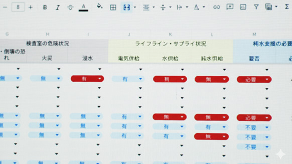 これに伴い宮臨技では災害対策マニュアルを整備し、年に一度の災害対策訓練を行うように定められています。今回は訓練の事前に県内各ご施設の代表者の方に案内し、宮臨技で用意したGoogleスプレッドシートに各施設で想定された被災状況を入力していただきました。