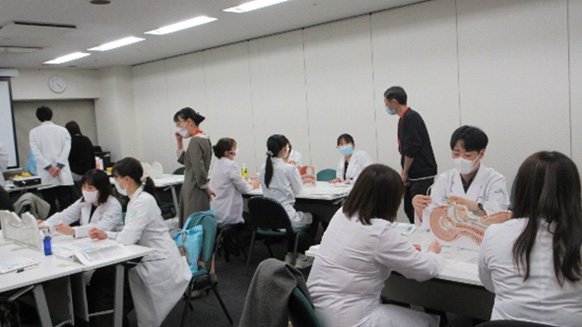 肛門機能、内視鏡検体採取について、動画視聴とグループ実習の様子
