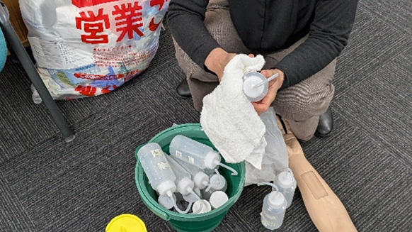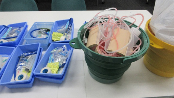 講習会当日は9:10からの受付開始に対し、会場の部屋が開くのが8時50分と、各部屋の実務委員達が設営に奔走します。講習会終了後は、後片付けです。特に静脈路確保・造影剤注入では使用物品も多く、疑似血などを使用した模型や洗浄瓶の水洗いやゴミの廃棄も多く、手分けして作業に当たります。元のように梱包ボックスに詰めて、宮臨技事務所に発送してもらうよう守衛さんにお願いします。最後に会場の忘れ物を確認して解散です。後日、宮臨技事務所では事務局員が使用した物品を確認し、干して乾燥して保管するなどの作業があります。